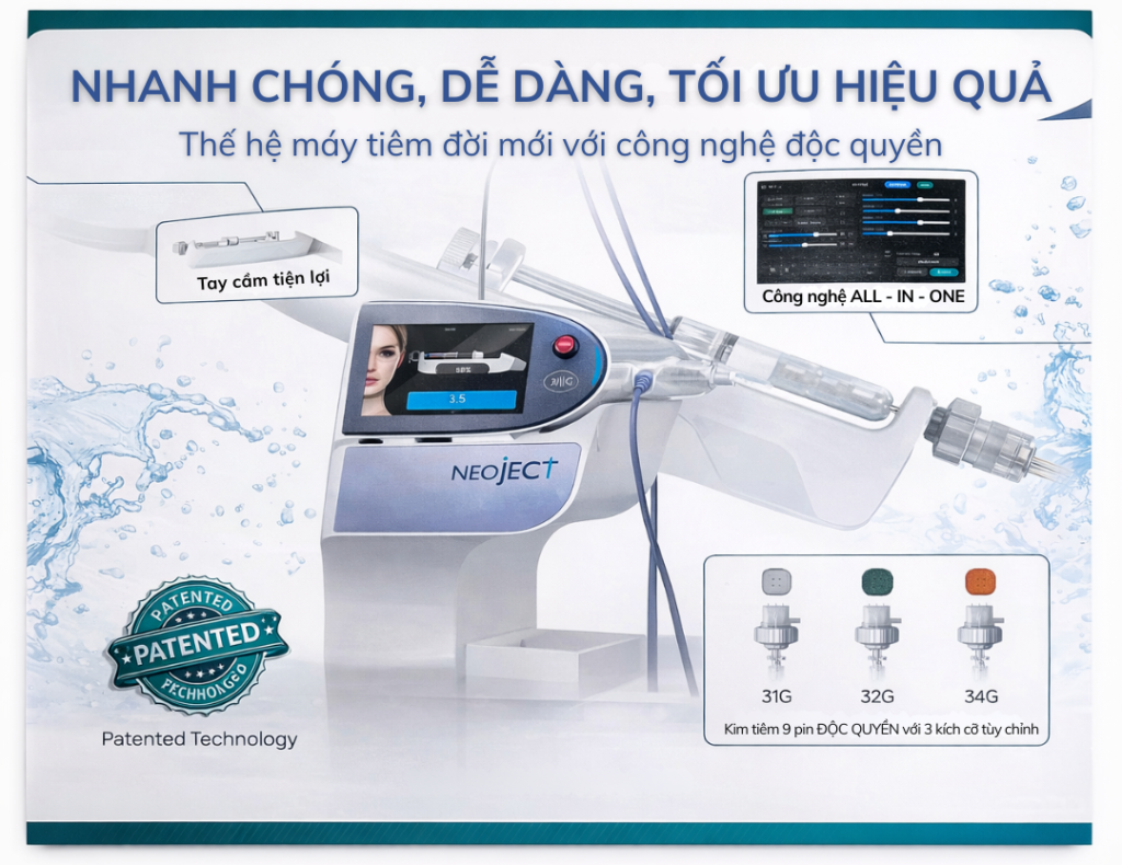 Điểm mạnh của NEOJECT nằm ở hệ thống điều khiển thông minh. Người dùng có thể dễ dàng điều chỉnh độ sâu, tốc độ và liều lượng tiêm theo từng tình trạng da. Nhờ đó, hoạt chất được phân bố đồng đều, giúp tăng hiệu quả rõ rệt sau liệu trình.